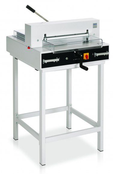 Pohodlné a přesné řezání do formátu A3, délka řezu 430 mm, elektromechanický pohon nože a digitální zobrazení míry zadního dorazu. Hloubka vložení stohu 435 mm, výška stohu 40 mm. Made in Germany.